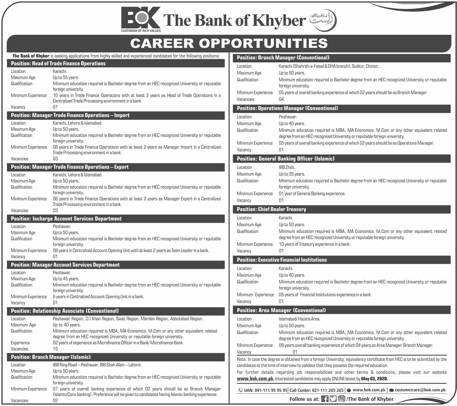 Banking Staff Jobs In The Bank of Khyber April 2020