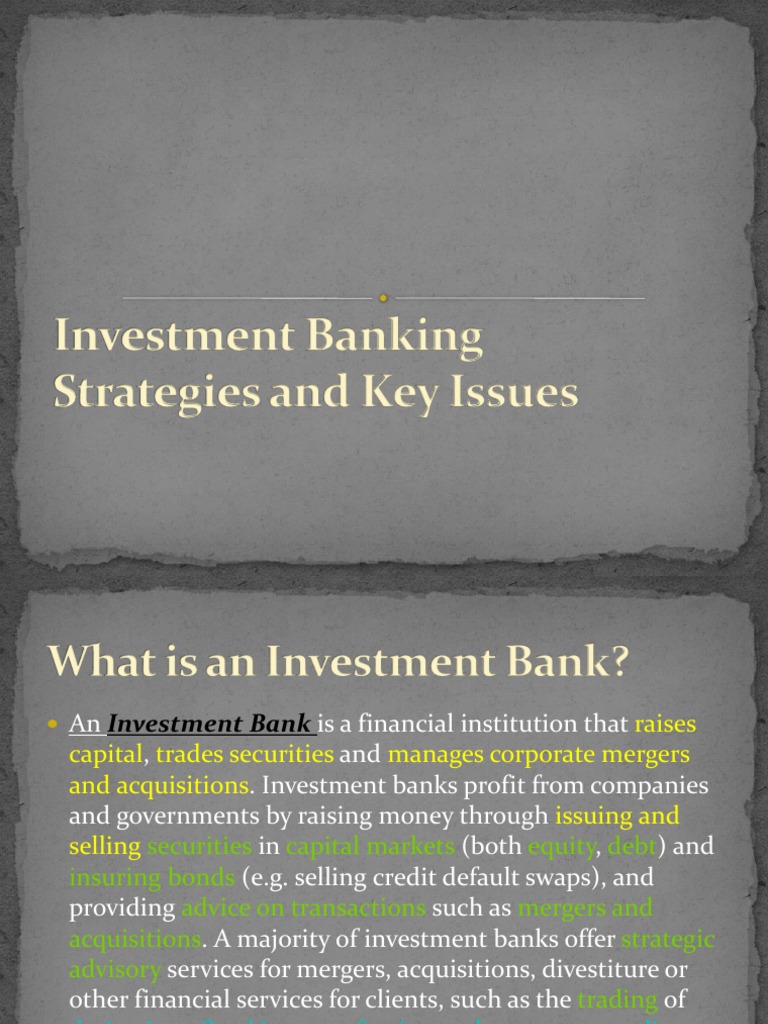 Mergers And Acquisitions Investment Banking. Mergers and acquisitions (M&A) is a general term used to describe the consolidation of companies or assets through various types of financial transactions, including mergers M&A deals generate sizable profits for the investment banking industry, but not all mergers or acquisition deals close. Investment banks play a significant role in corporate restructuring, and are often heavily involved in the M&A process.