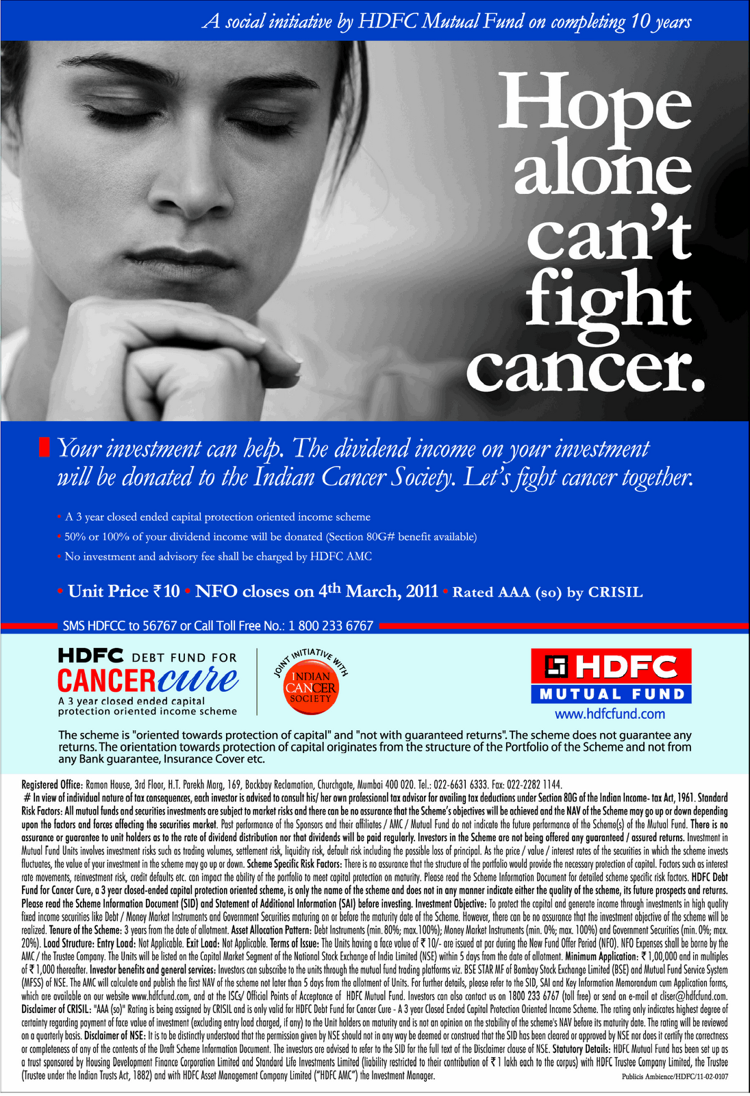 Print Ads: HDFC Mutual Funds - Debit fund for cancer cure